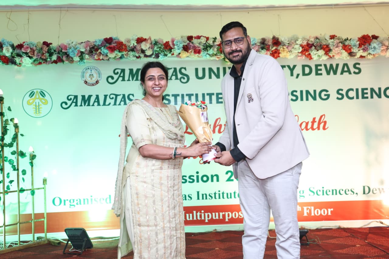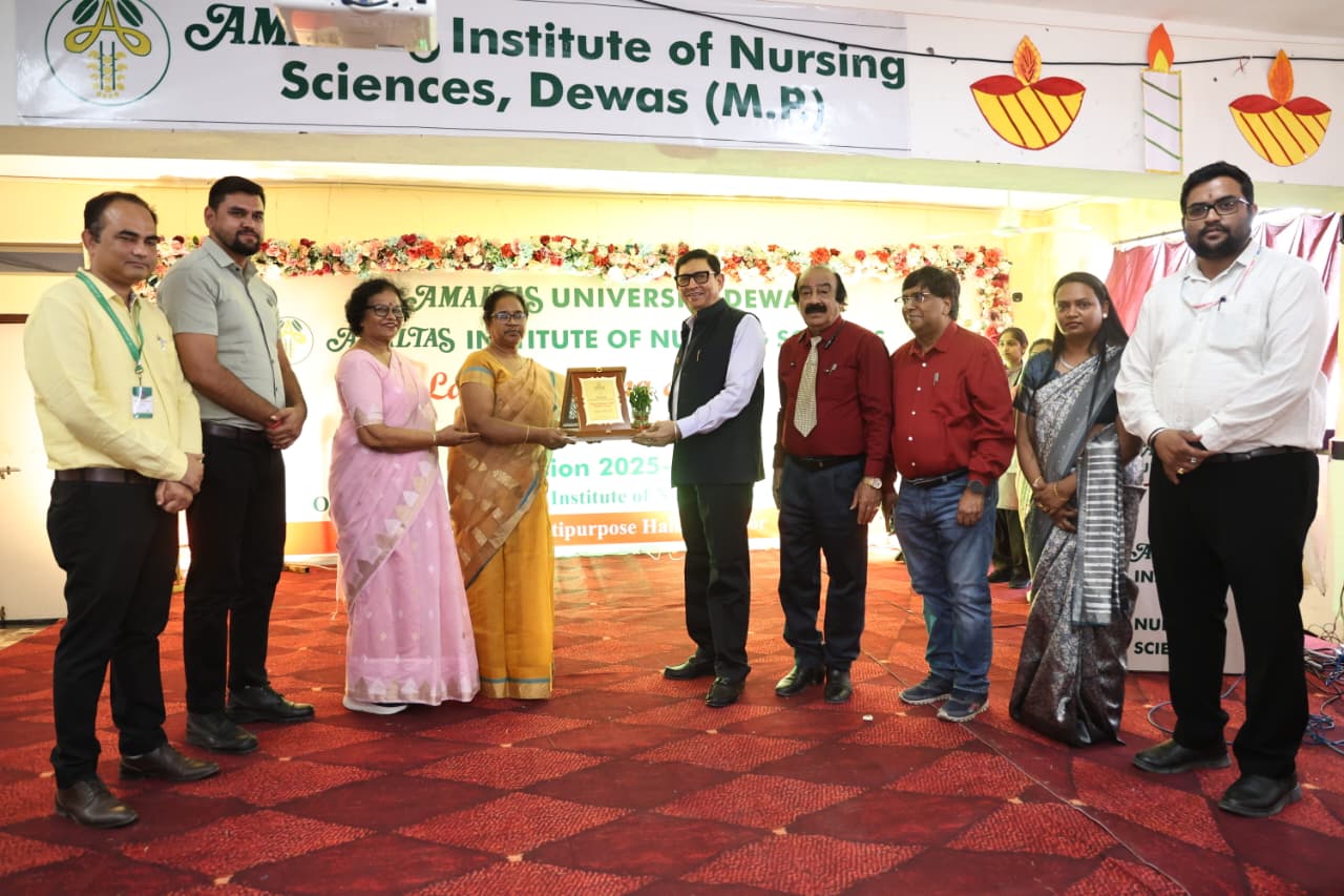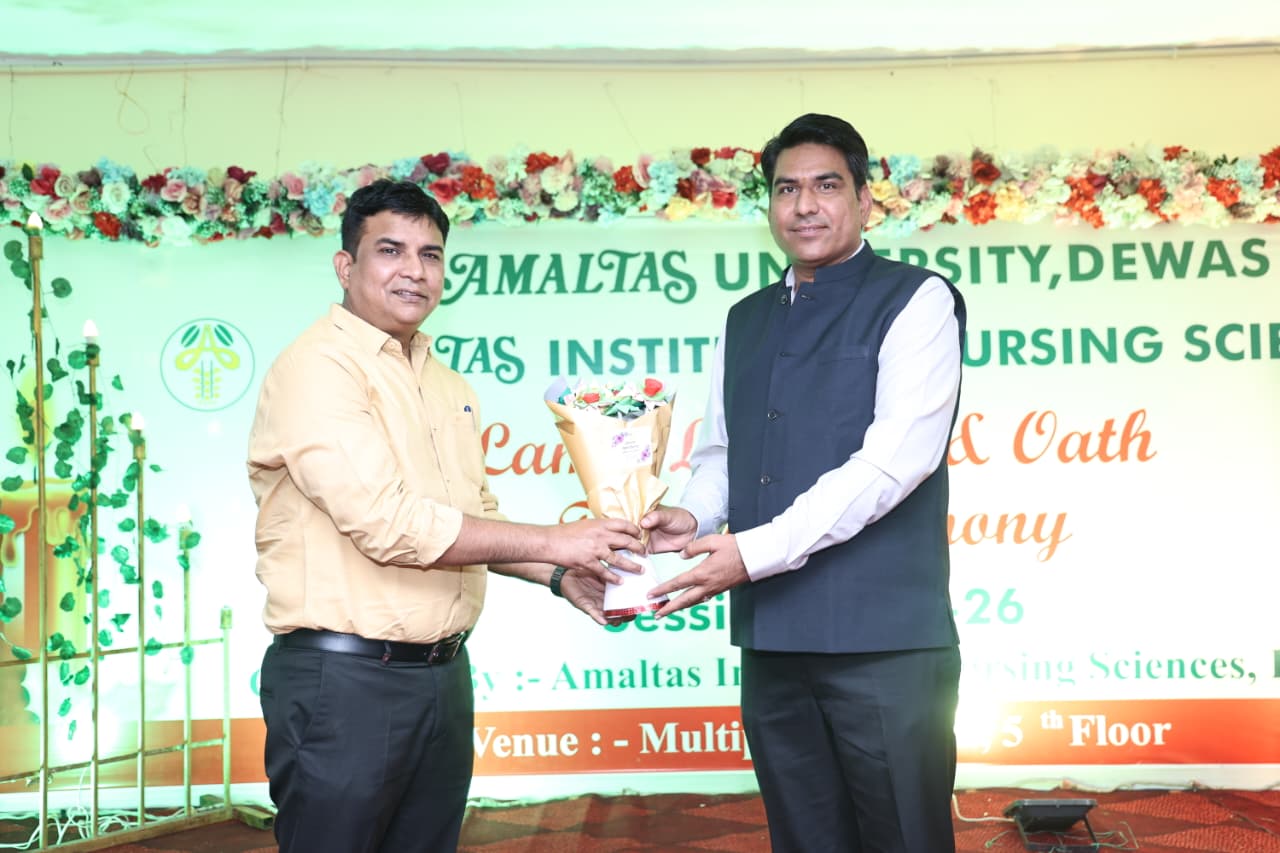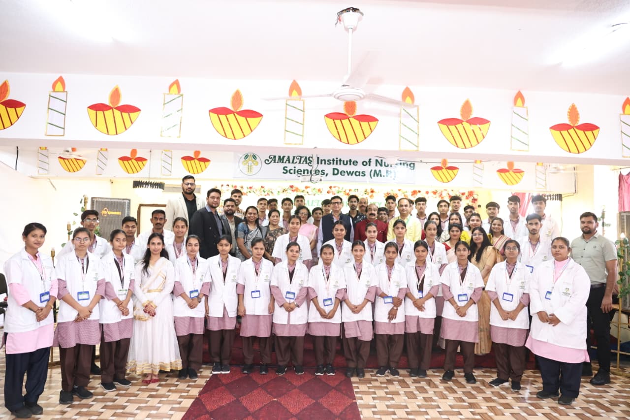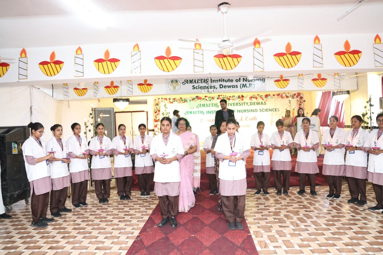 A lamp lighting and oath taking ceremony was organized at Amaltas Institute of Nursing Science for newly admitted B.Sc. Nursing and GNM students. The presence of Shri Suresh Singh Bhadauria, Founder of Amaltas Group, motivated and encouraged the students. The ceremony was graced by chief guests Dr. Deepak Pippal, Regional Joint Health Officer, Dr. Neha Titus, Principal, Patidar Nursing College (Ujjain), and Dr. Sarojini Jamesbek, Chief Medical and Health Officer, Dewas. The dignitaries highlighted the importance of nursing as a noble and service-oriented profession. Principal Dr. Sangeeta Tiwari informed students about the wide scope of nursing and shared that nursing officers today serve not only in hospitals but also in community health, military, air force, navy, forensic, research, legal advisory, and infection prevention roles. During the ceremony, Dr. Peter administered the oath of service and dedication to the students, while Vice-Principal Dr. Mohsin Khan presented the annual progress report. Meritorious students were also honored for their academic and extracurricular achievements. On this occasion, Vice Chancellor Dr. Sharad Chandra Wankhede, Registrar Dr. Abhay Gupta, Director Dr. Prashant, Hospital Manager Dr. Manish Sharma, Dr. Sneha Sahay, along with faculty members and staff of the nursing college, were present.