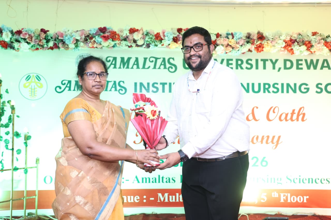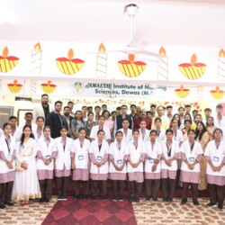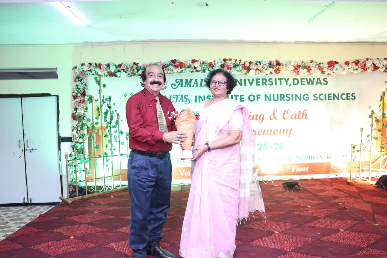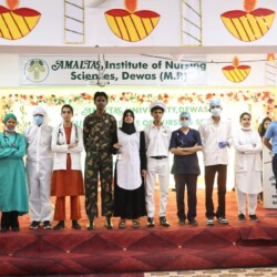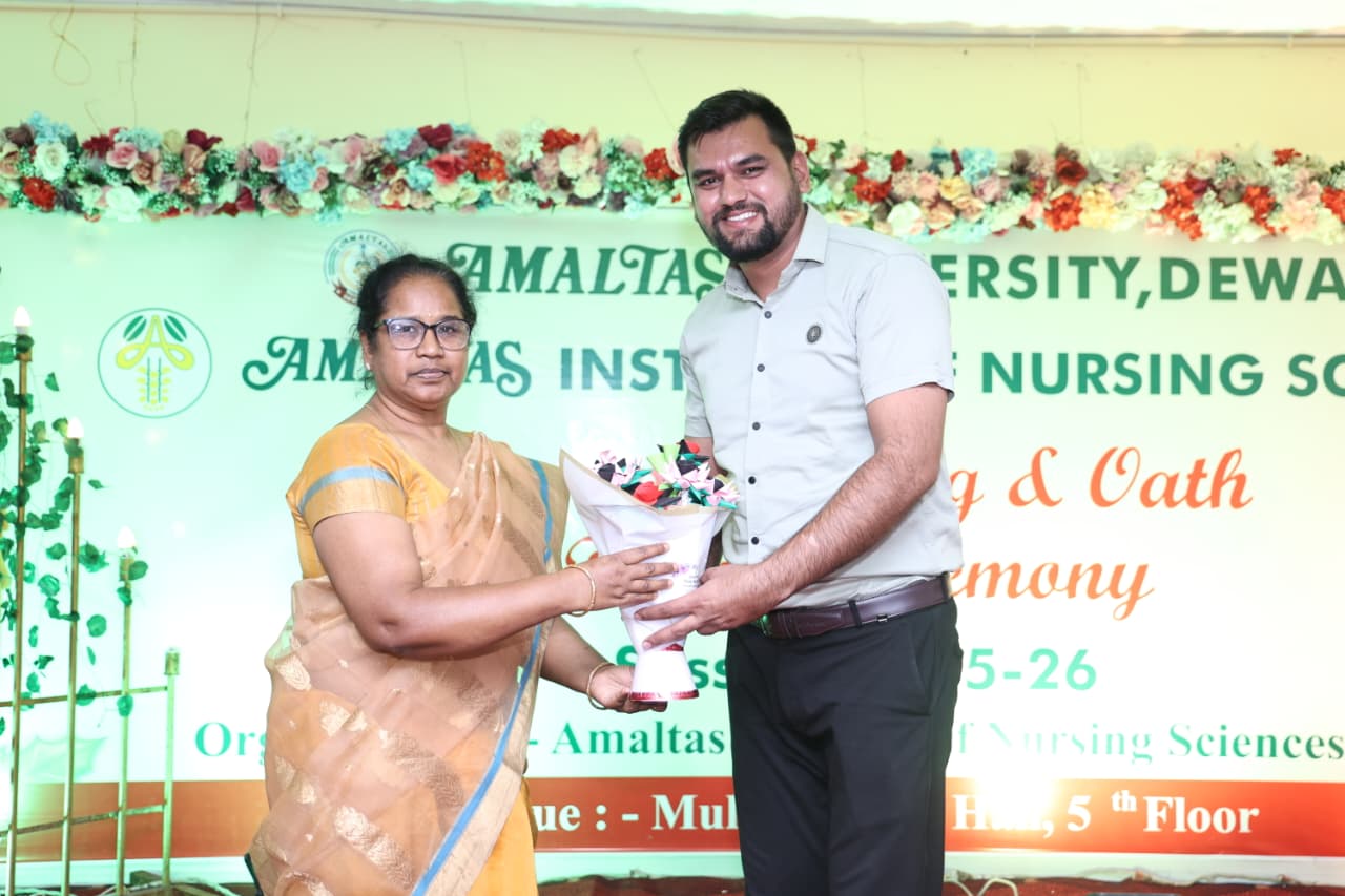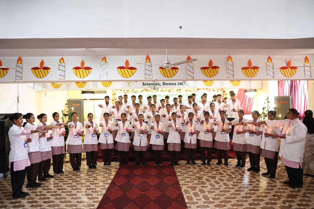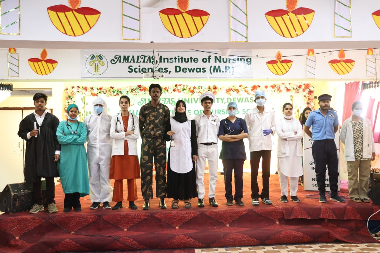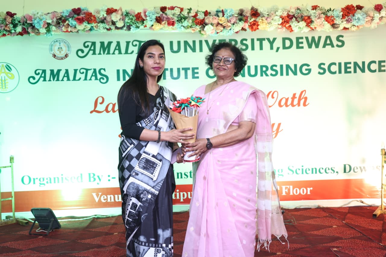 A lamp lighting and oath taking ceremony was organized at Amaltas Institute of Nursing Science for newly admitted B.Sc. Nursing and GNM students. The presence of Shri Suresh Singh Bhadauria, Founder of Amaltas Group, motivated and encouraged the students. The ceremony was graced by chief guests Dr. Deepak Pippal, Regional Joint Health Officer, Dr. Neha Titus, Principal, Patidar Nursing College (Ujjain), and Dr. Sarojini Jamesbek, Chief Medical and Health Officer, Dewas. The dignitaries highlighted the importance of nursing as a noble and service-oriented profession. Principal Dr. Sangeeta Tiwari informed students about the wide scope of nursing and shared that nursing officers today serve not only in hospitals but also in community health, military, air force, navy, forensic, research, legal advisory, and infection prevention roles. During the ceremony, Dr. Peter administered the oath of service and dedication to the students, while Vice-Principal Dr. Mohsin Khan presented the annual progress report. Meritorious students were also honored for their academic and extracurricular achievements. On this occasion, Vice Chancellor Dr. Sharad Chandra Wankhede, Registrar Dr. Abhay Gupta, Director Dr. Prashant, Hospital Manager Dr. Manish Sharma, Dr. Sneha Sahay, along with faculty members and staff of the nursing college, were present.