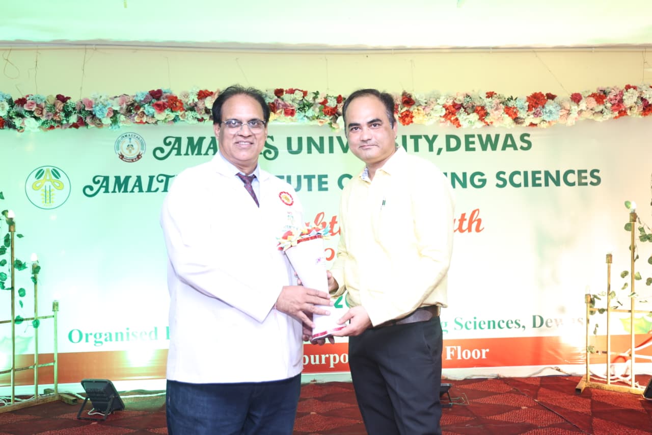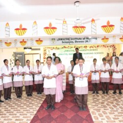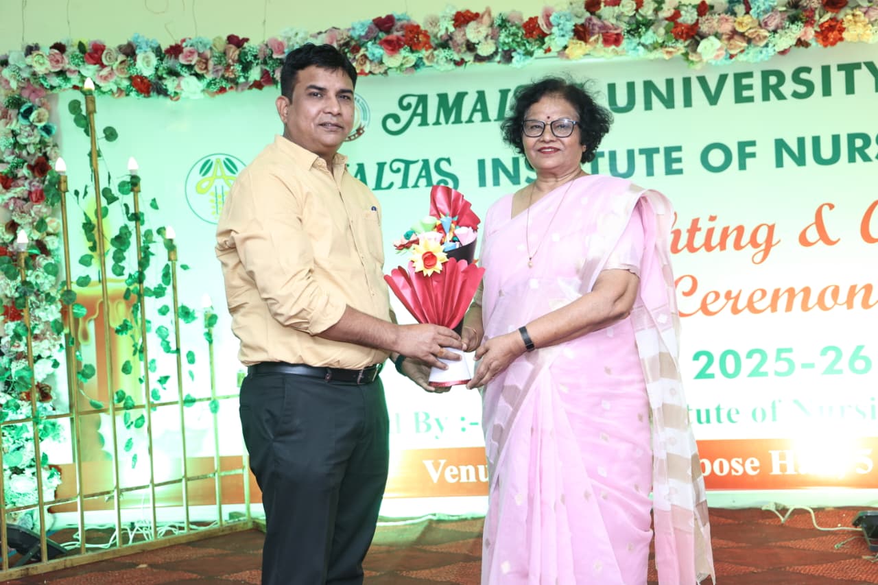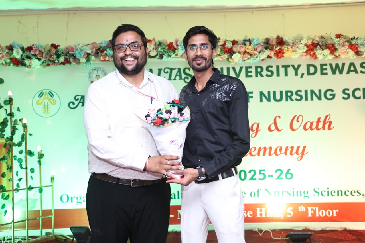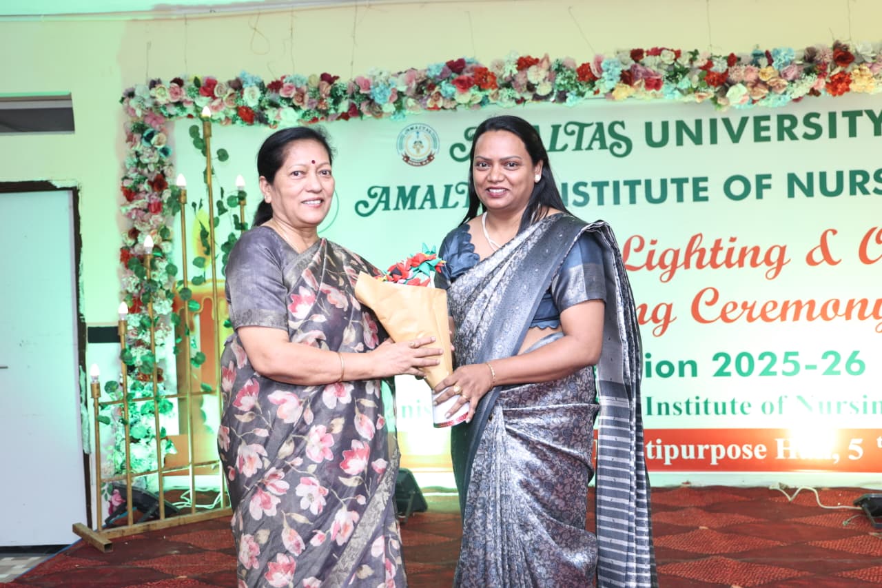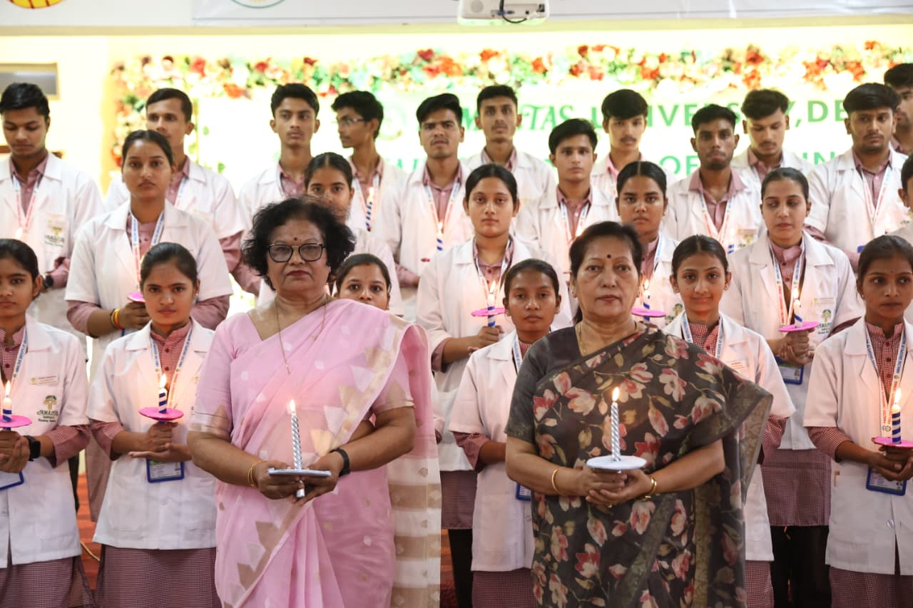 A lamp lighting and oath taking ceremony was organized at Amaltas Institute of Nursing Science for newly admitted B.Sc. Nursing and GNM students. The presence of Shri Suresh Singh Bhadauria, Founder of Amaltas Group, motivated and encouraged the students. The ceremony was graced by chief guests Dr. Deepak Pippal, Regional Joint Health Officer, Dr. Neha Titus, Principal, Patidar Nursing College (Ujjain), and Dr. Sarojini Jamesbek, Chief Medical and Health Officer, Dewas. The dignitaries highlighted the importance of nursing as a noble and service-oriented profession. Principal Dr. Sangeeta Tiwari informed students about the wide scope of nursing and shared that nursing officers today serve not only in hospitals but also in community health, military, air force, navy, forensic, research, legal advisory, and infection prevention roles. During the ceremony, Dr. Peter administered the oath of service and dedication to the students, while Vice-Principal Dr. Mohsin Khan presented the annual progress report. Meritorious students were also honored for their academic and extracurricular achievements. On this occasion, Vice Chancellor Dr. Sharad Chandra Wankhede, Registrar Dr. Abhay Gupta, Director Dr. Prashant, Hospital Manager Dr. Manish Sharma, Dr. Sneha Sahay, along with faculty members and staff of the nursing college, were present.